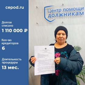 Списано долгов на 1 110 000 р. за 13 месяцев. Кол-во кредиторов - 6 шт.