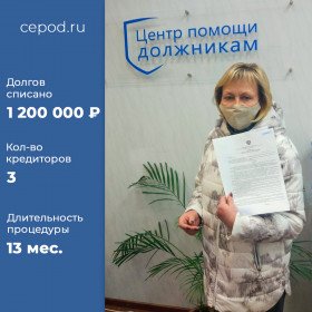 Списано долгов на 1 200 000 р. за 13 месяцев. Кол-во кредиторов - 3 шт.