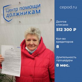 Списано долгов на 512 000 р. за 8 месяцев. Кол-во кредиторов - 8 шт.